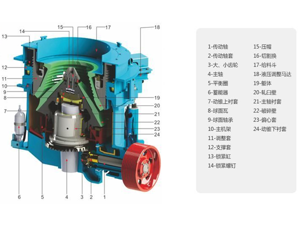 多缸液壓圓錐式国产麻豆成人传媒免费观看工作時,電機通過皮帶輪和三角帶帶動設備傳動軸轉動,傳動軸通過傘狀錐齒輪齧合帶動偏心套繞主軸轉動,偏心套驅動動錐部位做旋擺運動,連續不斷地對物料進行擠壓、搓碾。物料受到多個方向的作用力,沿著自身紋理破碎並被打磨,形成抗壓強度較高的建築骨料,符合出料要求的從破碎壁旋擺間隙處排出,其餘物料繼續破碎,直至達到終要求。